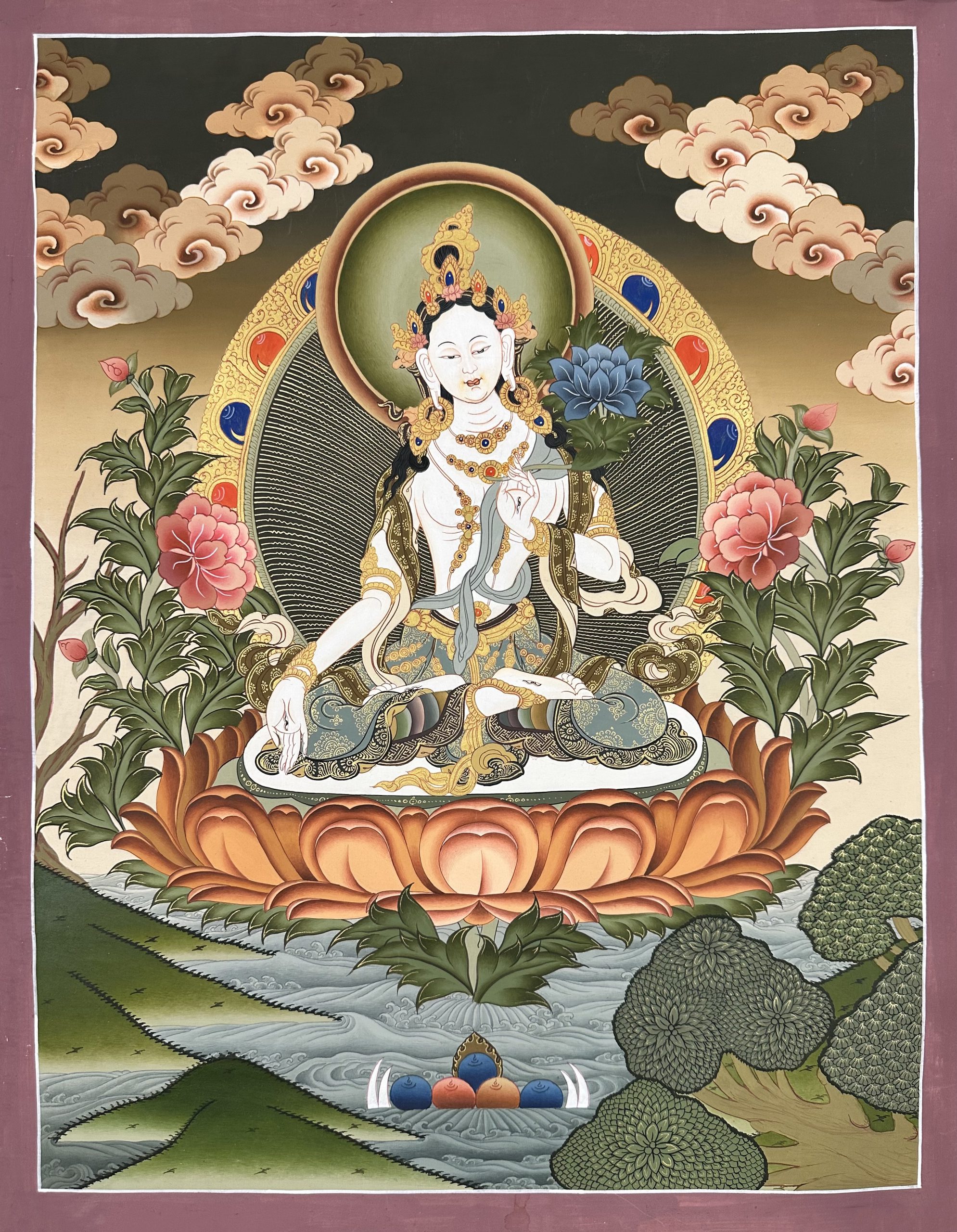 Thangka painting depicting White Tara is perfect for various home and office decor ideas. This 100% handmade Thangka can be decorated as an elegant and eccentric wall hanging in your home or office. It can also be placed in your home for meditation purposes, as well as an artifact to your spiritual seeking.